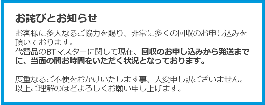 代替品(BTマスター)のお届けに当面の間お時間を頂く見込みとなっております。
